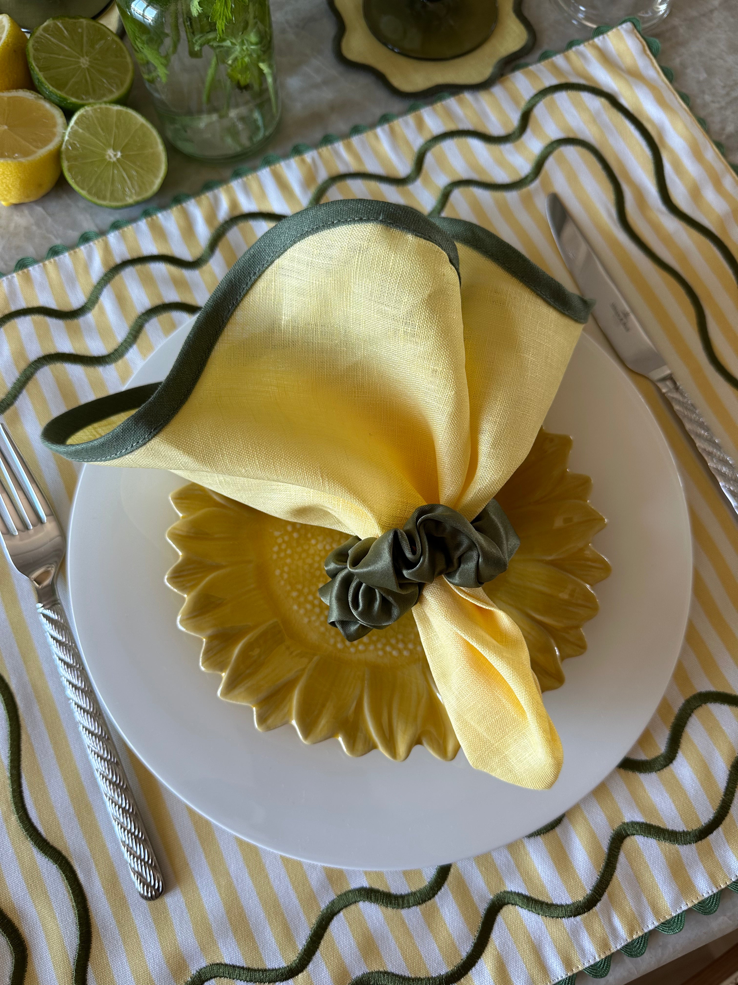 Notre set de table est doublé, une face à rayure jaune et blanc et broderie verte, l'autre face unie, et ornée d'un liseret vert kaki.