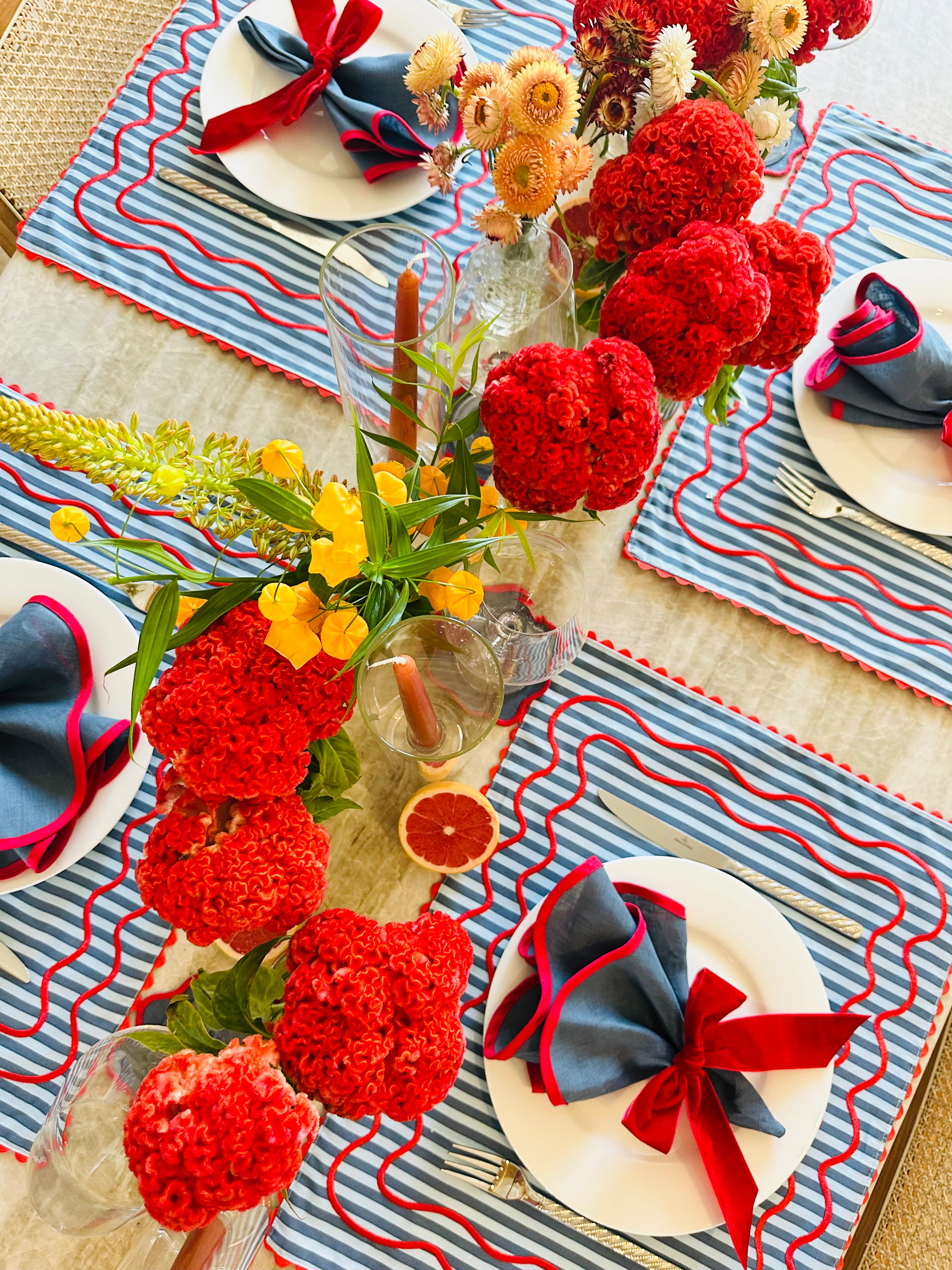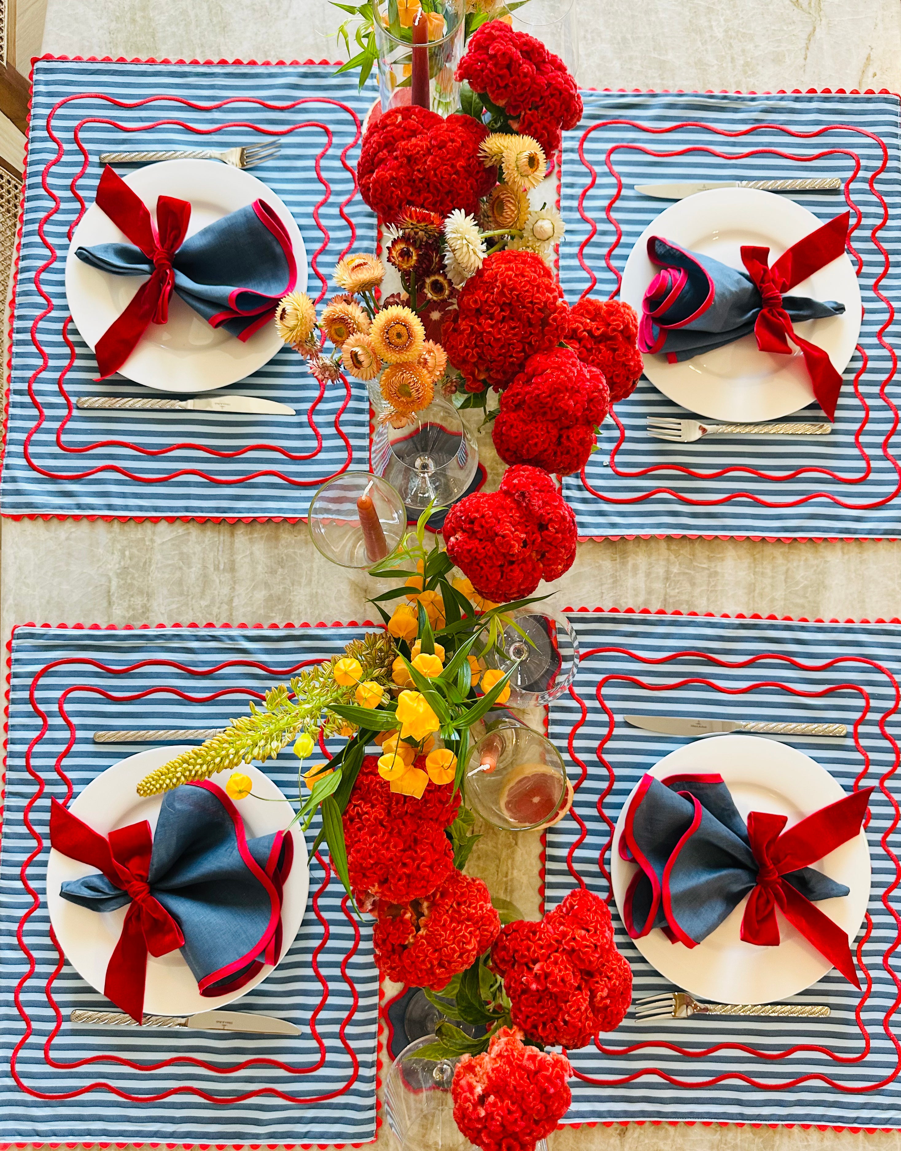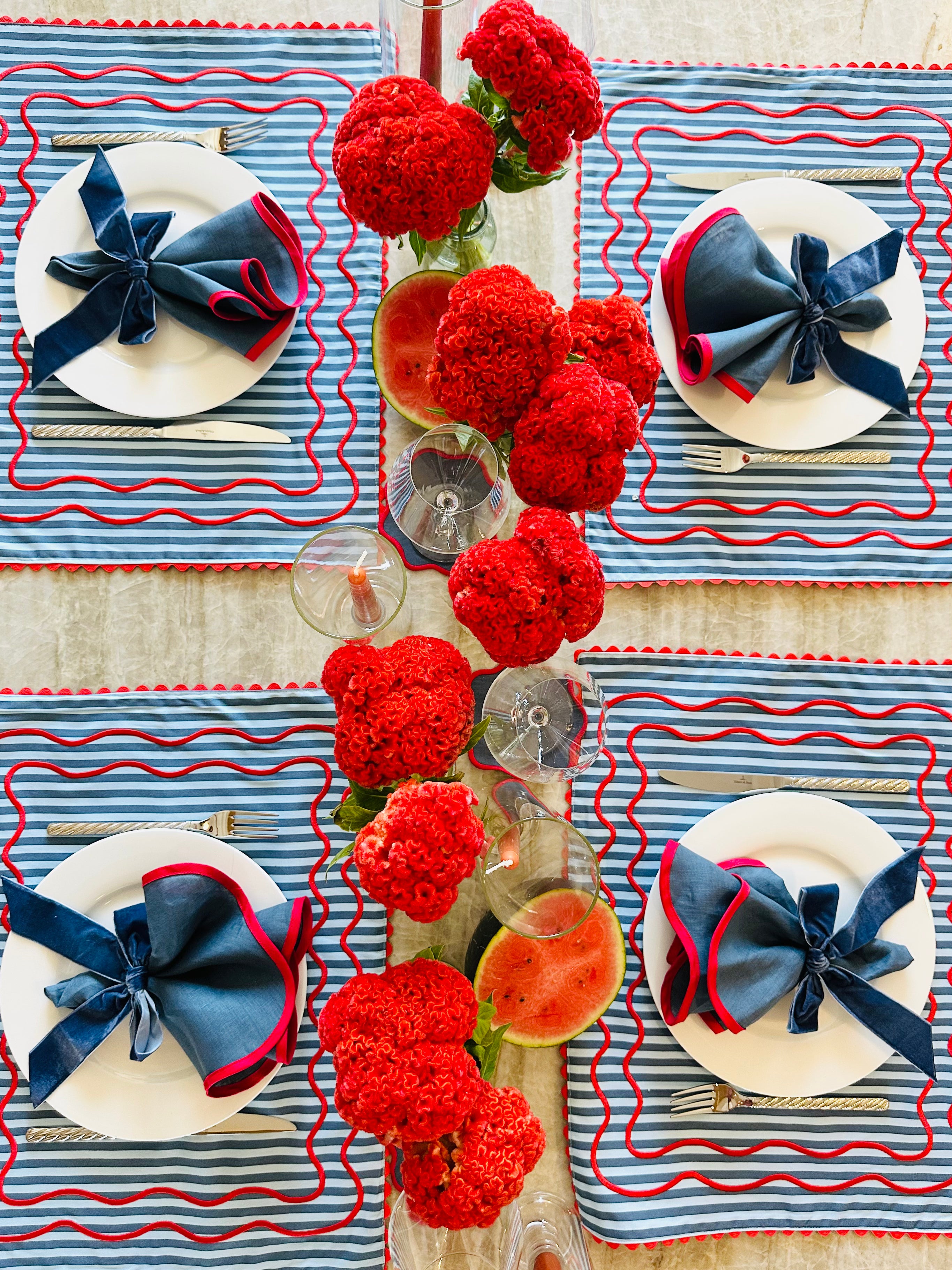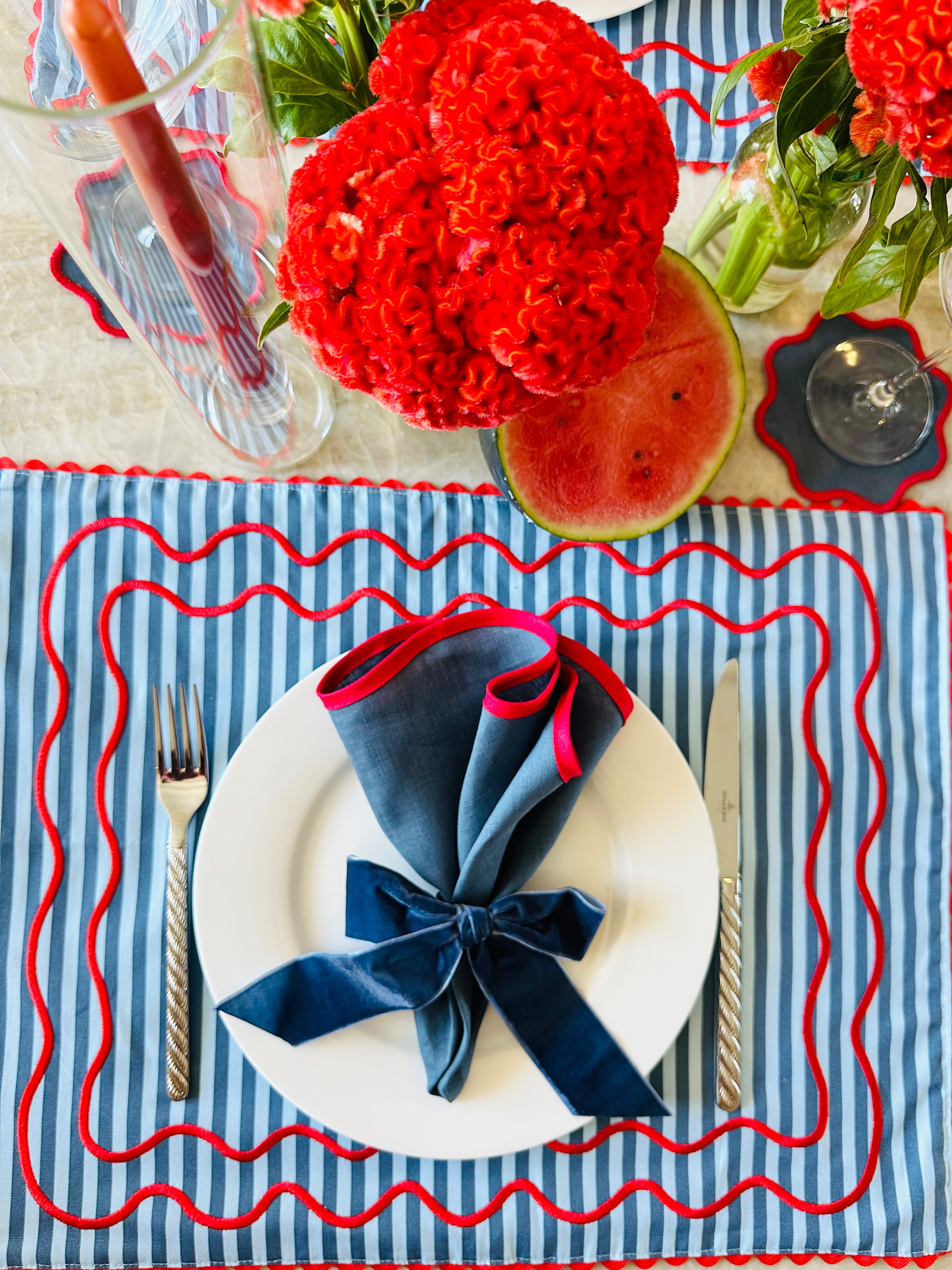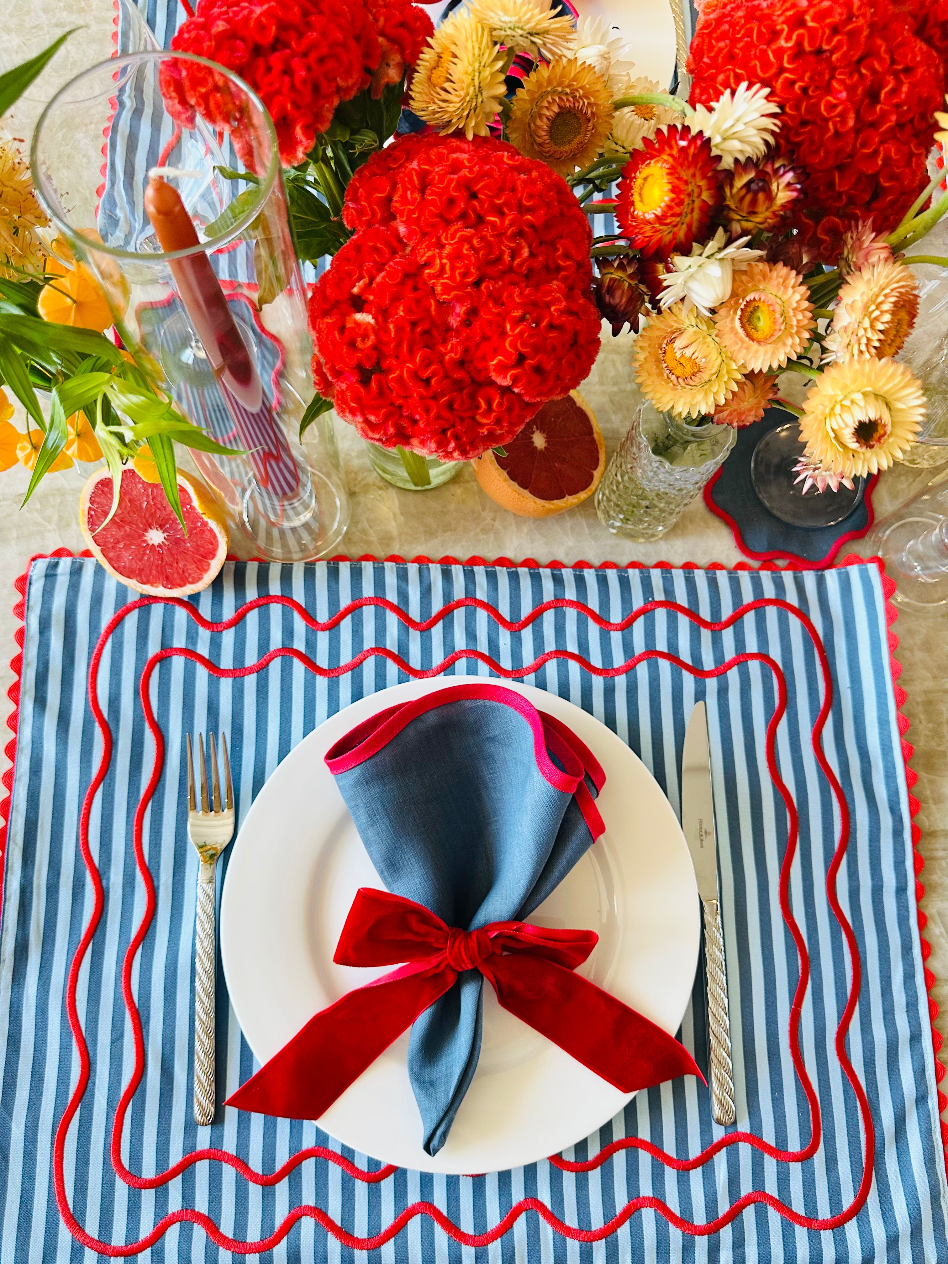 - un set de table rectangle agrémenté d'un galon rouge : une face à rayures rouges et bleus et broderie rouge, et l'autre face unie bleue