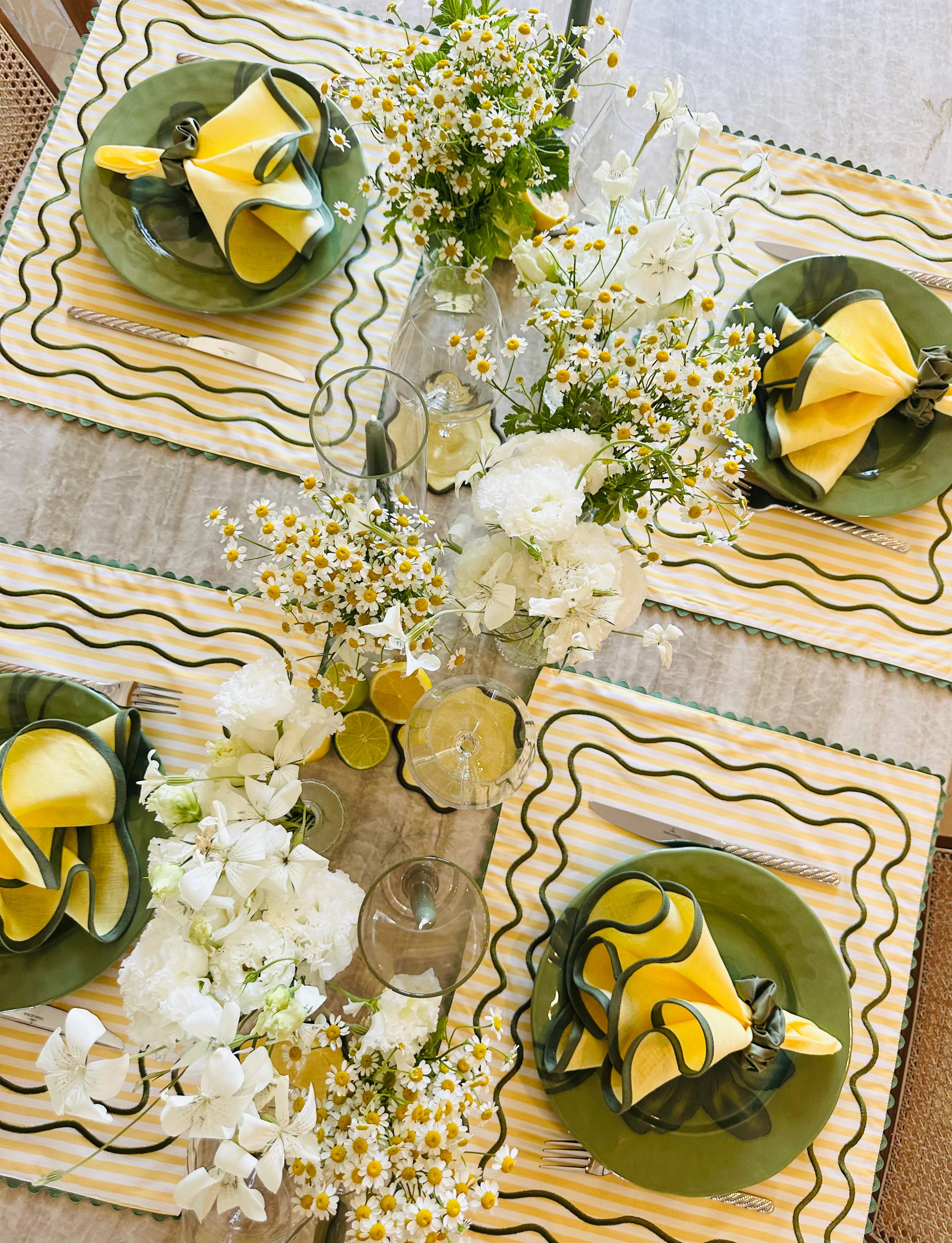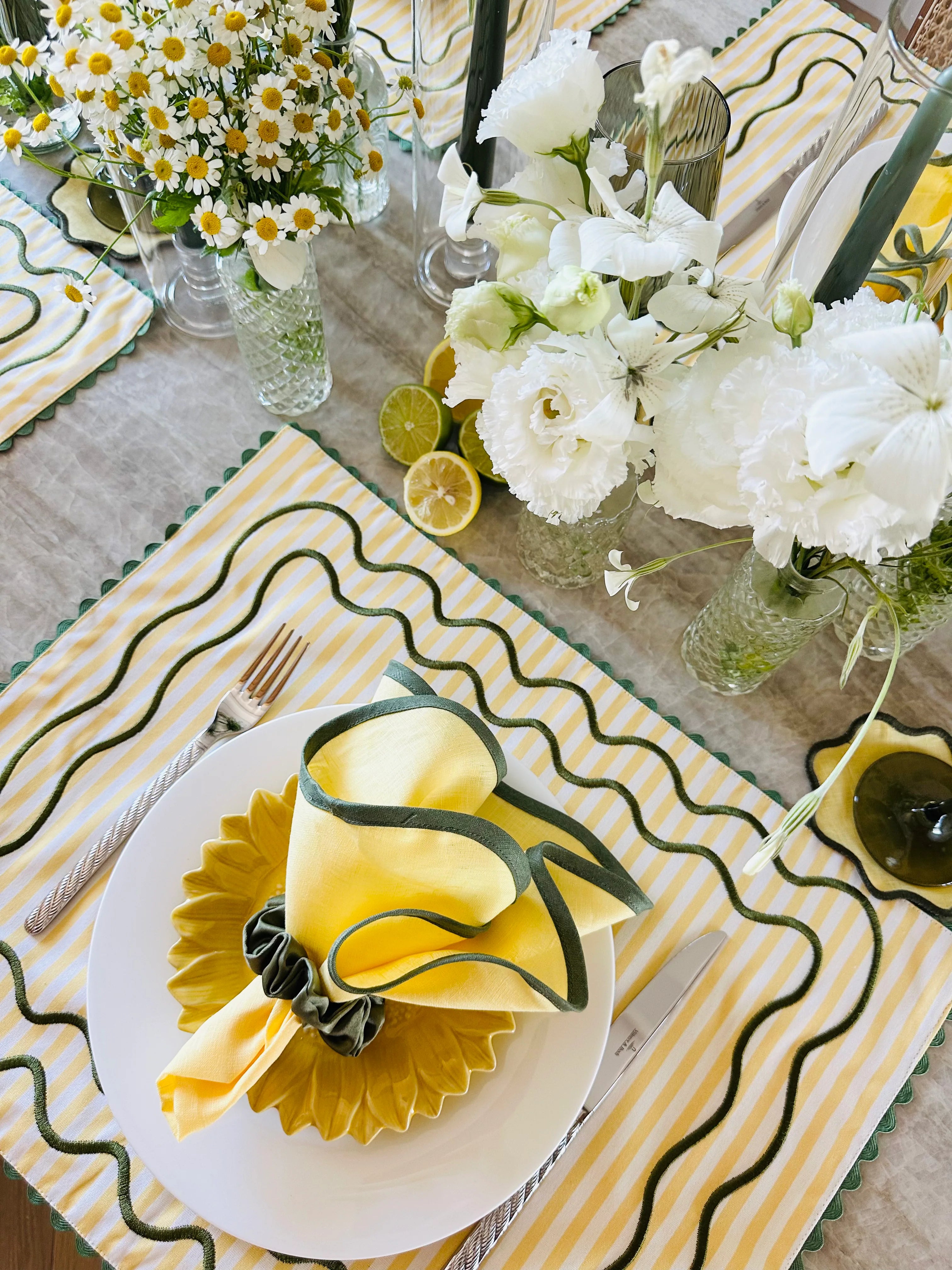 - un set de table rectangle agrémenté d'un galon vert : une face à rayures jaunes et blanches et broderie verte, et l'autre face unie jaune